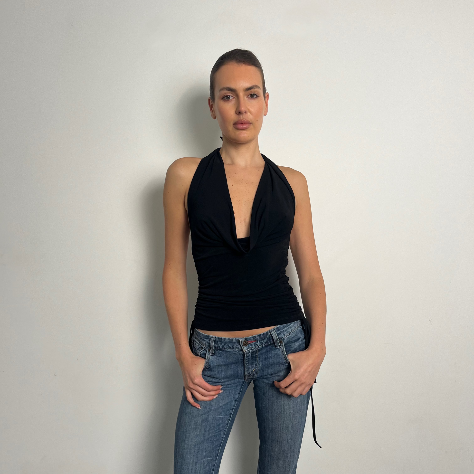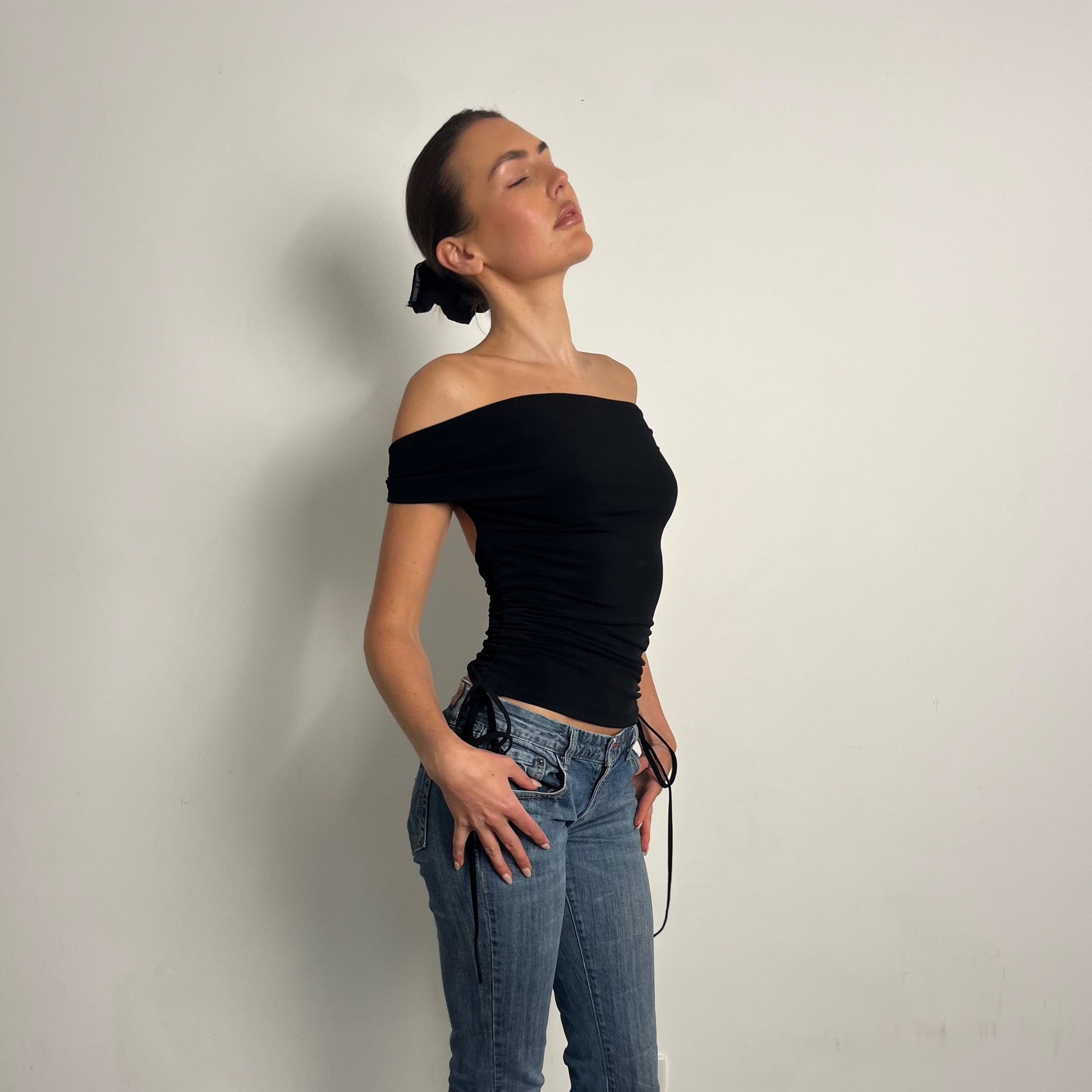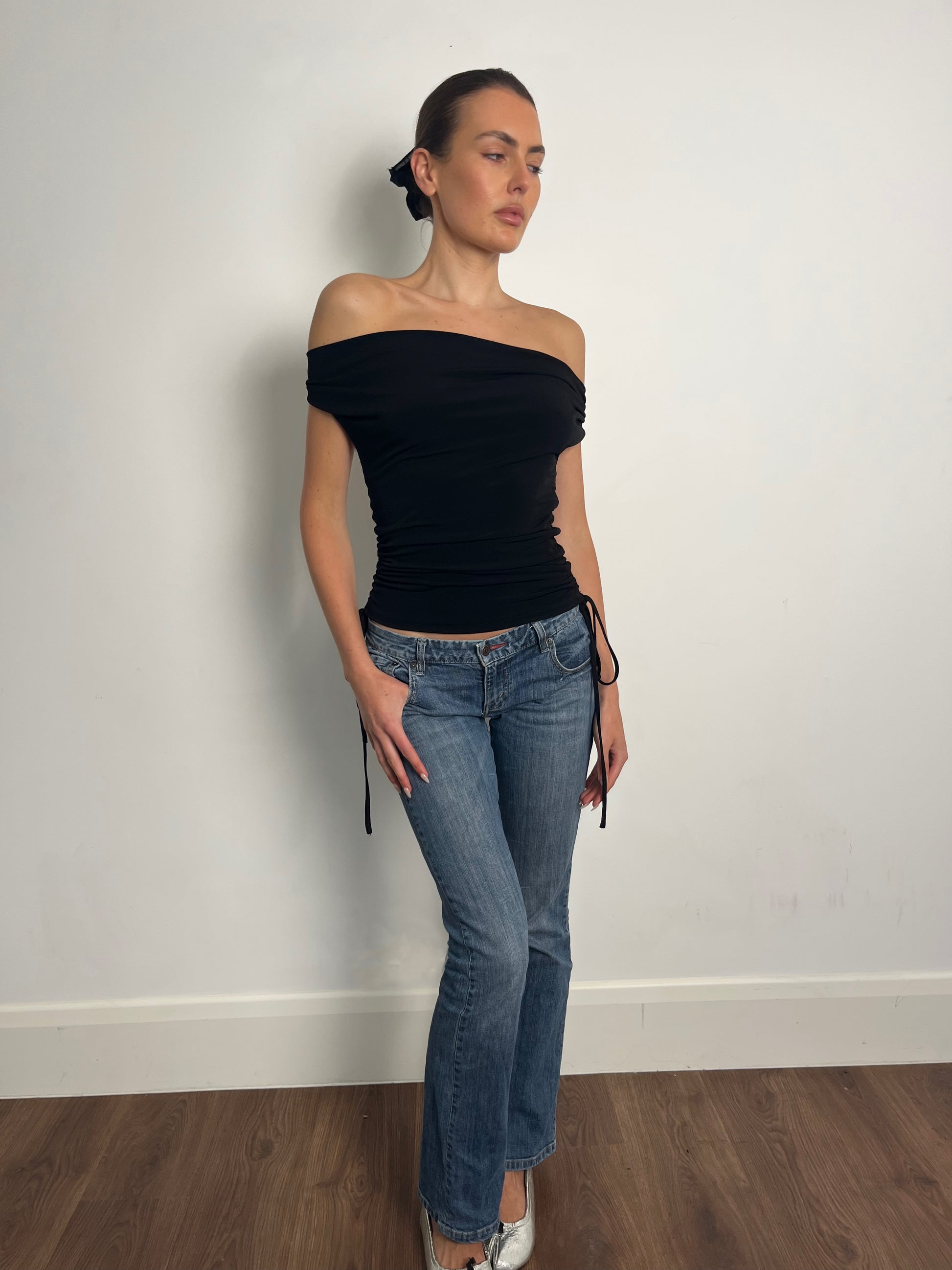 Black multiway top with adjustable side drawstrings for a personalised fit. Made from ITY stretch fabric for a soft, flexible feel that moves with you. Wear it more than 5 different ways. The side drawstrings let you customise the length and ruching for a look that’s completely your own.