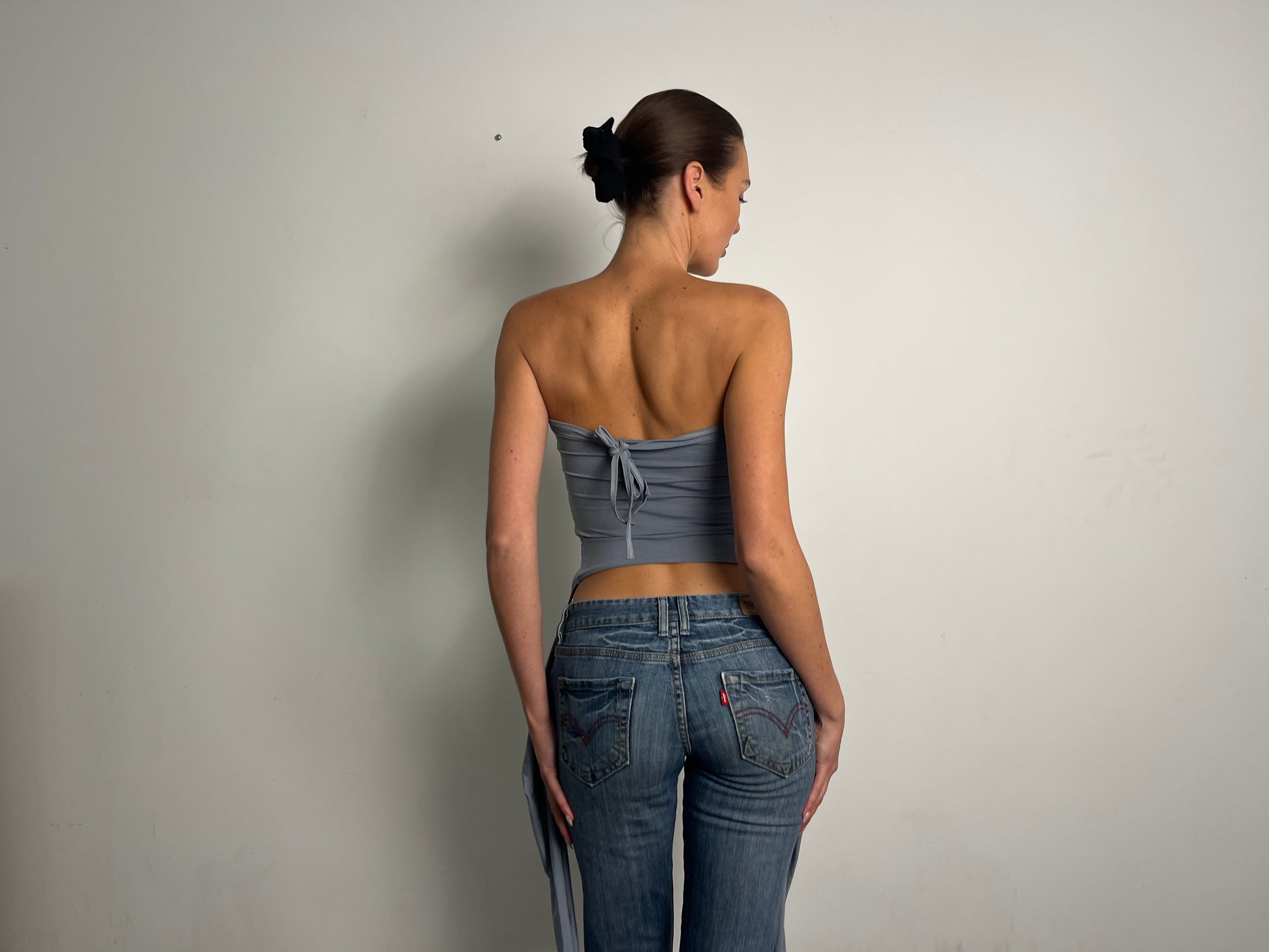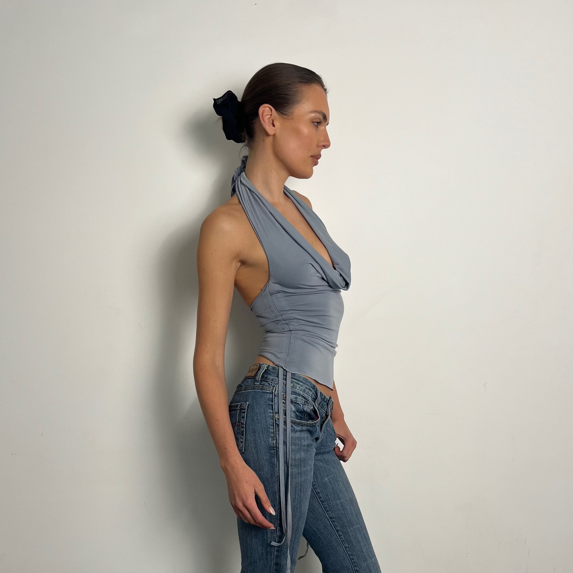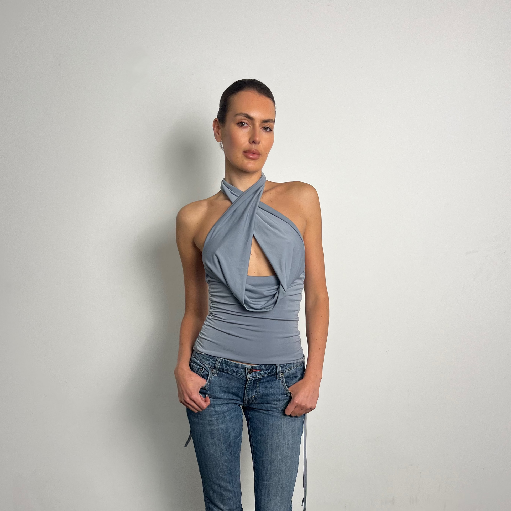 Baby blue multiway top with adjustable side drawstrings for a personalised fit. Made from ITY stretch fabric for a soft, flexible feel that moves with you. Wear it more than 5 different ways. Finished with a delicate lettuce hem, the side drawstrings let you customise the length and ruching for a look that’s completely your own.